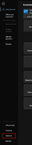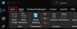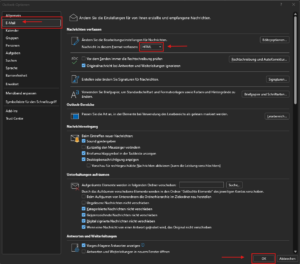 Sowohl in der aktiven Mail, die man gerade bearbeitet, als auch in der Hauptübersicht der Mail-Eingänge (der Reiter „Start“, den man ganz oben links in Outlook findet) kann man über den benachbarten Reiter „Datei“ und die dann weiter unten zu findenden „Optionen“ im Block „Nachrichten verfassen“ das Format von „RTF“ auf „HTML“ ändern, um sicherzustellen, dass auch Personen, die nicht Outlook als Mail-Programm verwenden, die empfangenen Mails öffnen und lesen können.